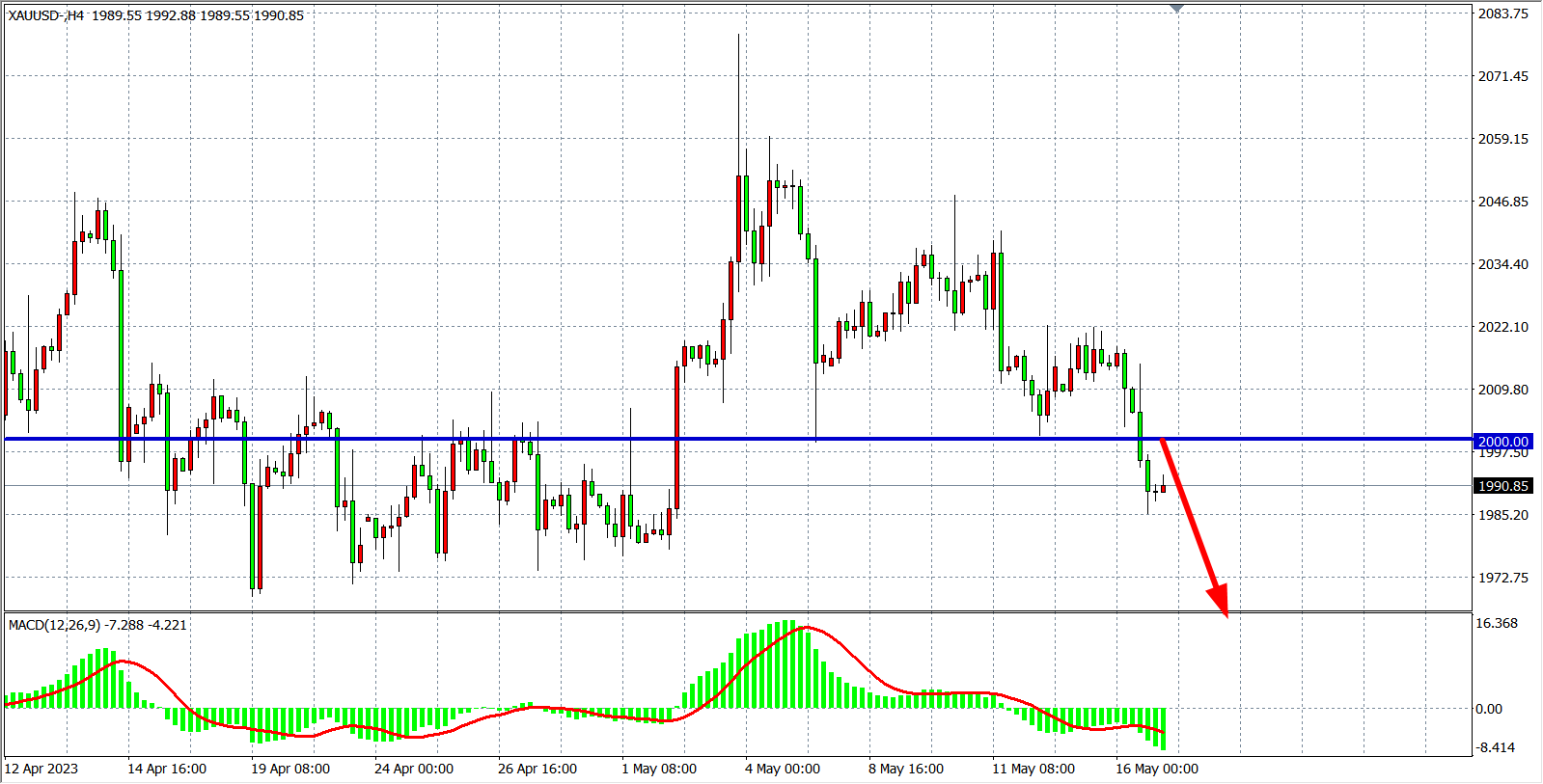 4小时图看,黄金跌破2000关口,MACD量能在零轴下放量,行情趋势转弱,在该位之下继续看跌1970-1950附近。