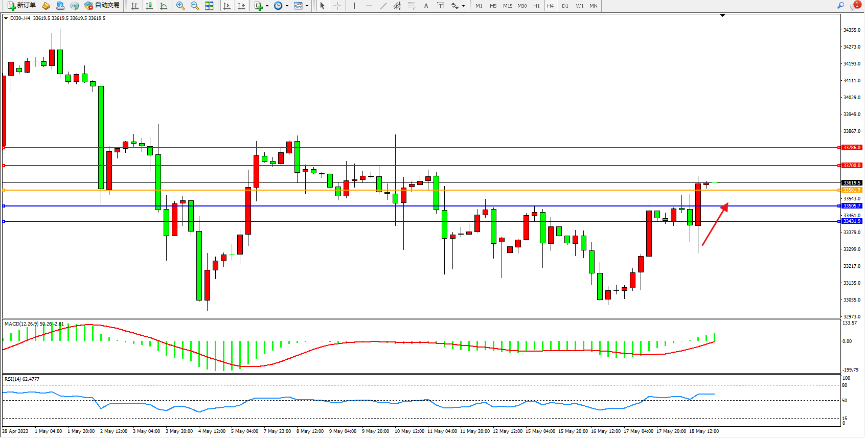 道琼斯指数DJ30——4小时K线图显示: