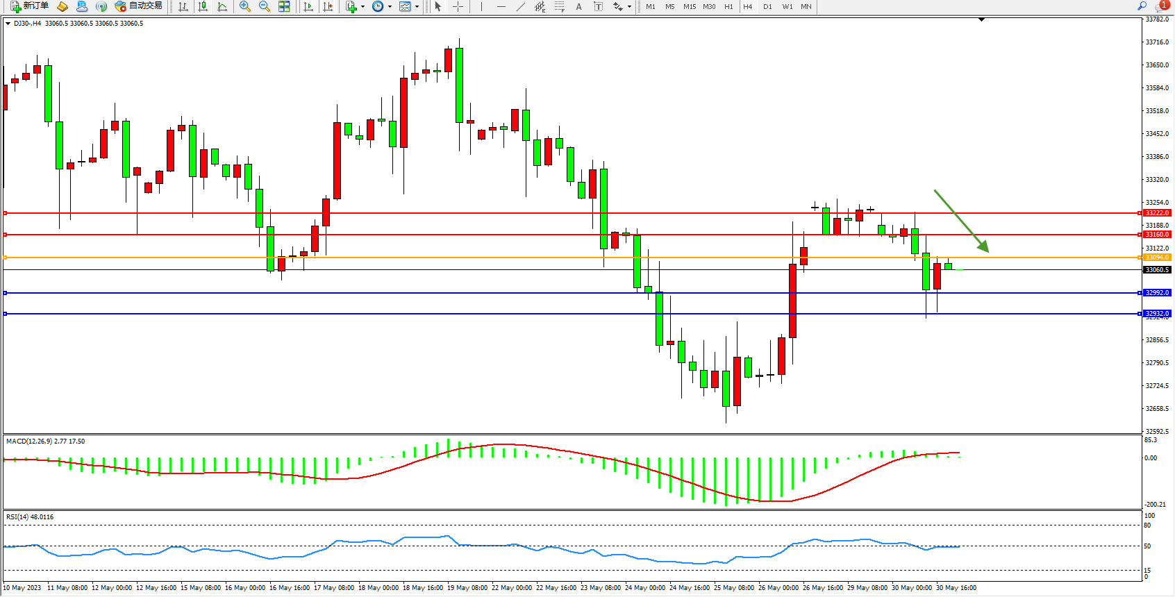 道琼斯指数DJ30——4小时K线图显示: