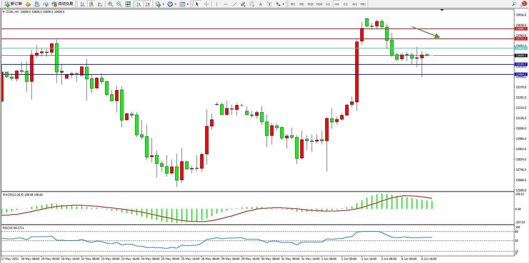 道琼斯指数DJ30——4小时K线图显示: