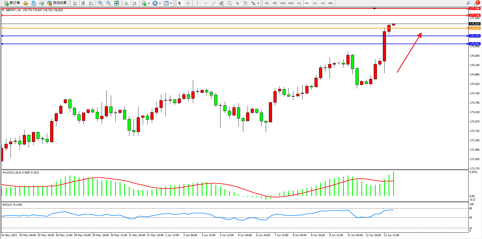 交易策略:176.653上方看涨,目标177.136  177.398