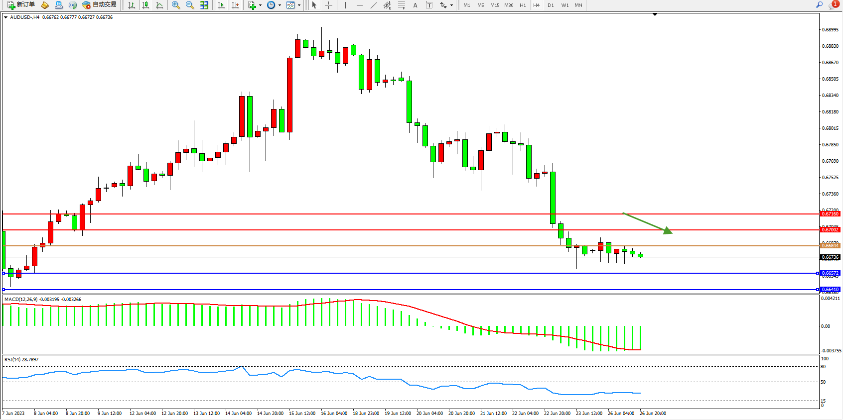 交易策略:0.66844下方看跌,目标0.66572  0.66410