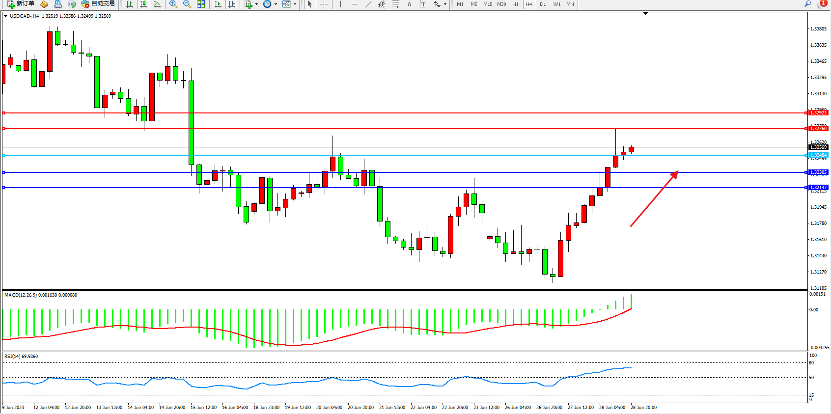 美元加元USDCAD——4小时K线图显示: