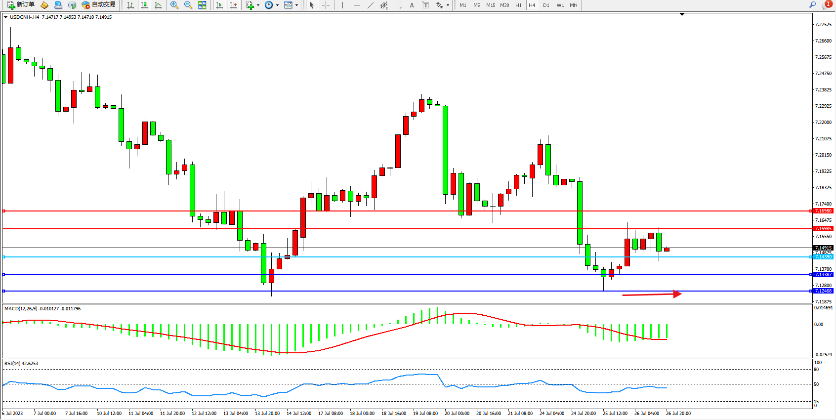 备选策略:7.14390下方看跌,目标7.13387 7.12468