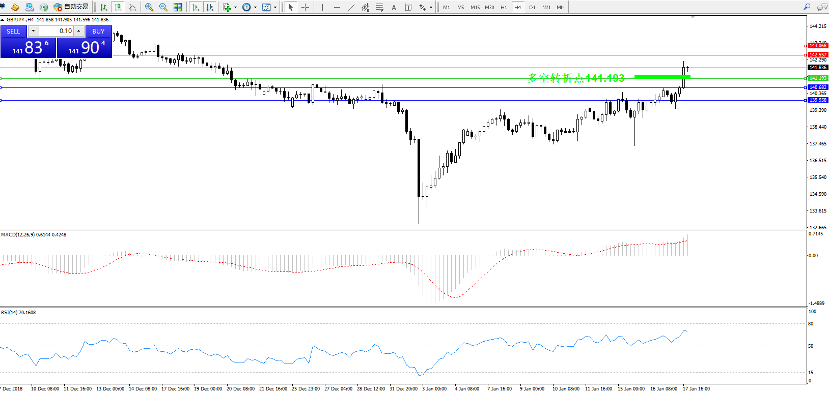 交易策略:141.193上方看涨,目标142.557、143.068
