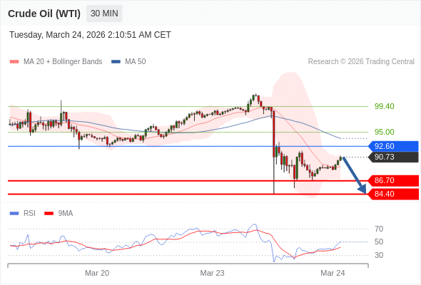 交易策略: 在 92.60 之下,看跌,目标价位为 86.70 ,然后为 84.40 。