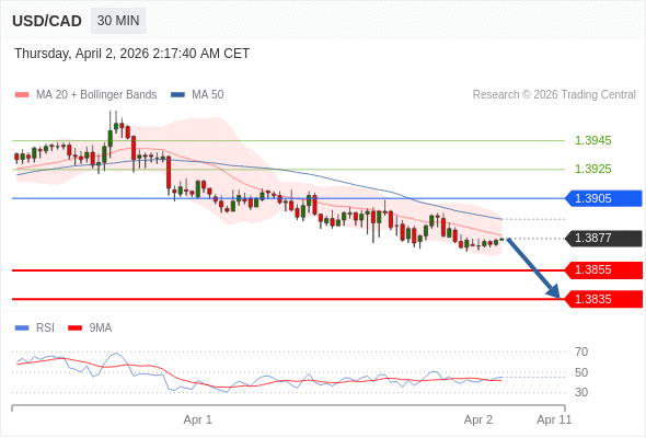 在 1.3905 之下,看跌,目标价位为 1.3855 ,然后为 1.3835 。