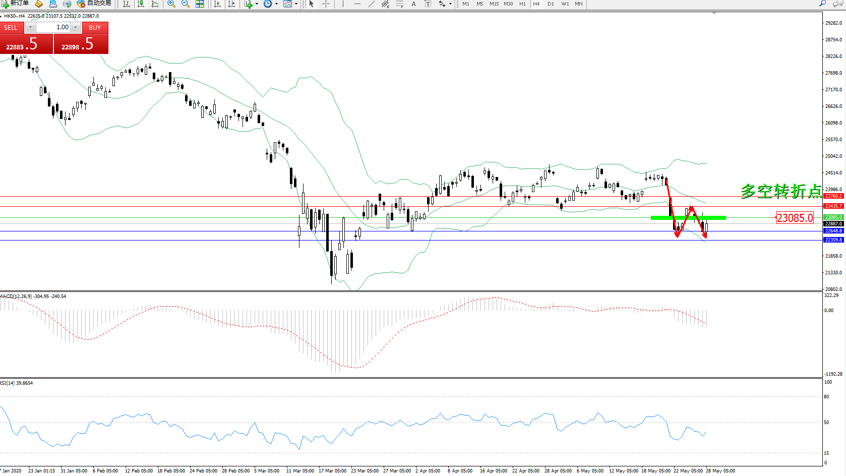 恒指HK50 ——4小时K线图显示:
