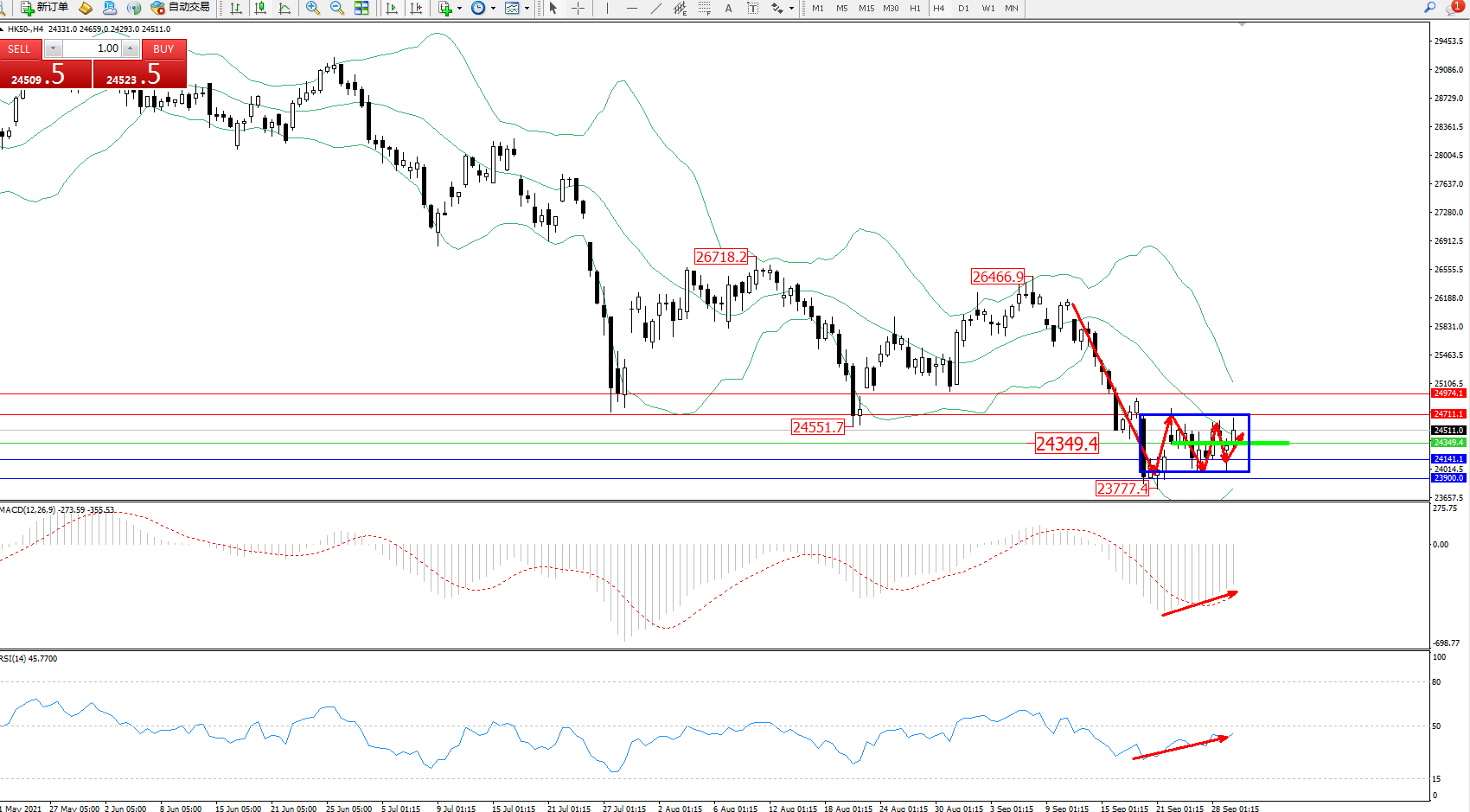 恒指HK50 ——4小时K线图显示: