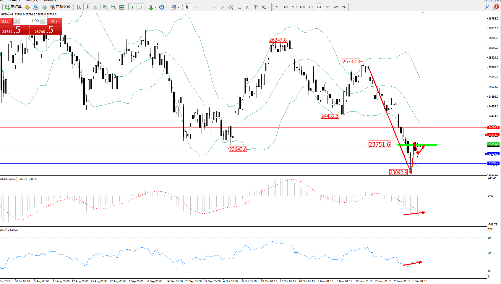 恒指HK50 ——4小时K线图显示: