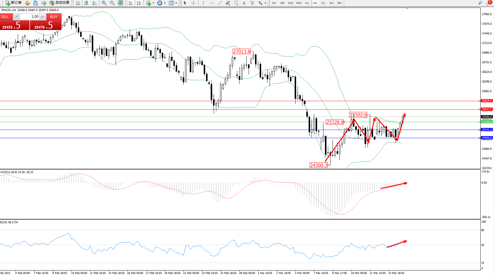 日经指数JPN225——4小时K线图显示: