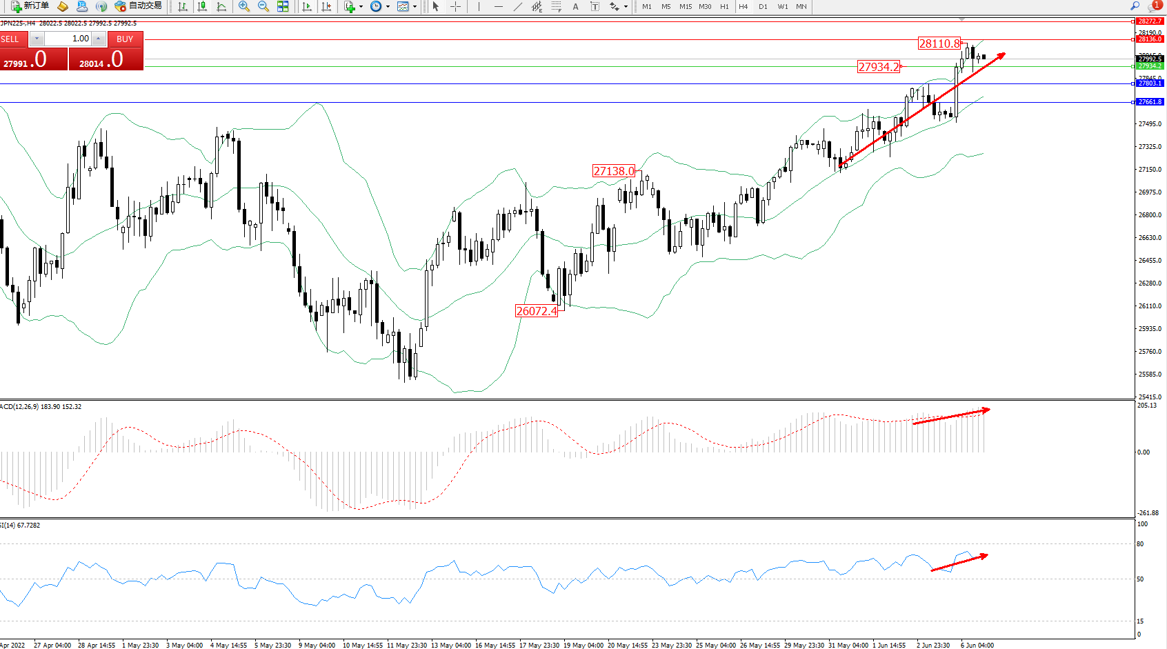 日经指数JPN225——4小时K线图显示: