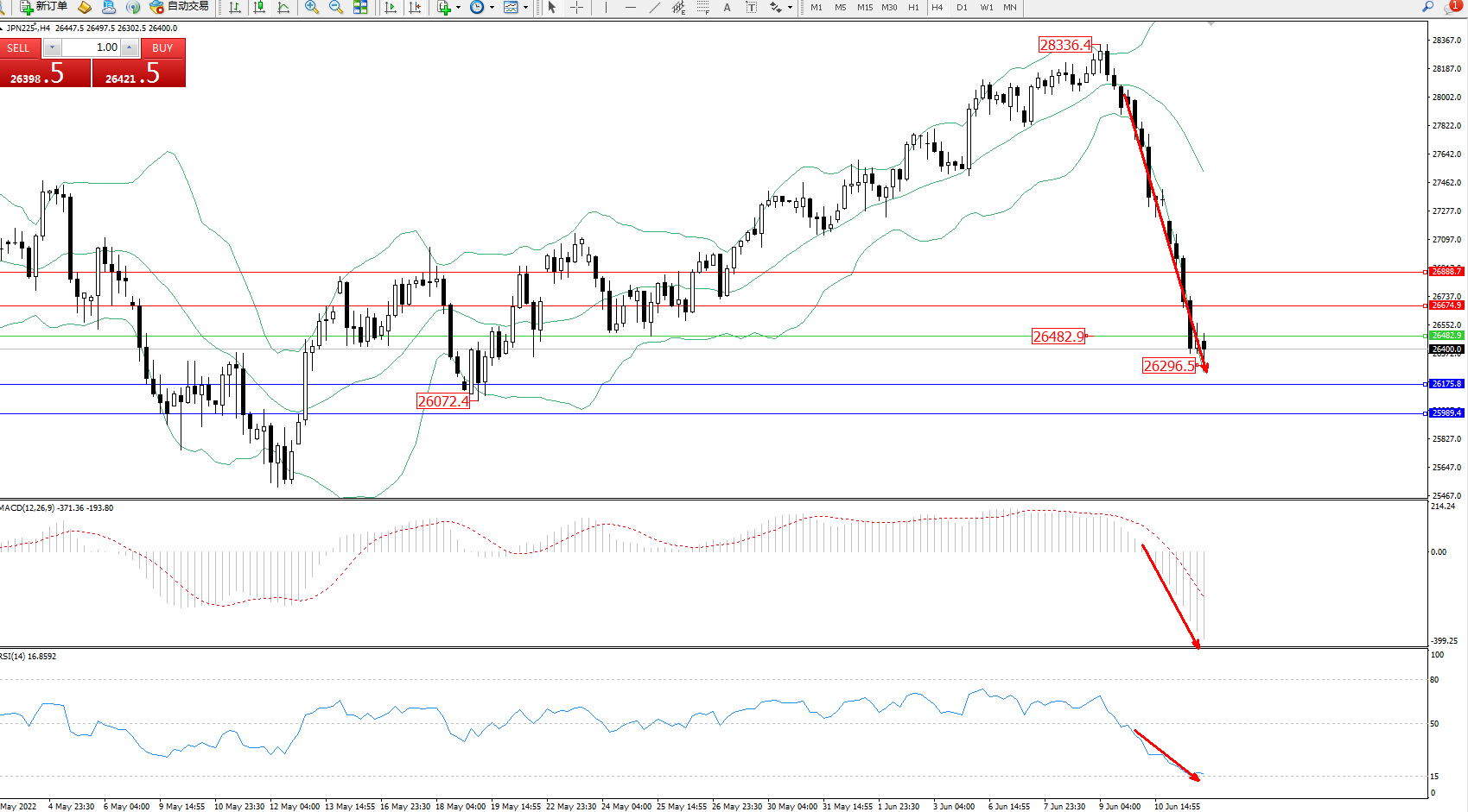 日经指数JPN225——4小时K线图显示:
