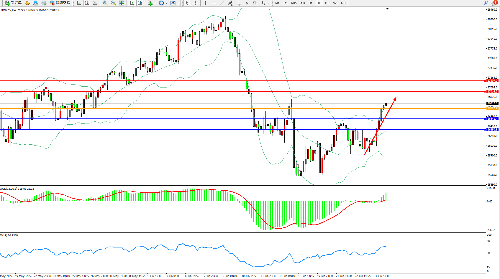 交易策略:26722上方看涨,目标27016、27207