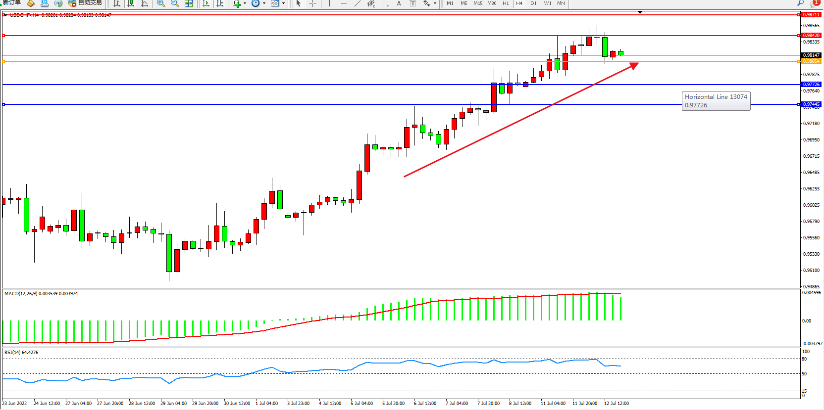 4小时图看:多头动力延续上行趋势线持续震荡上扬,短期多头拉升有继续向上移动迹象,MACD指标处于高位维持整理平移,RSI指标处于多头区域维持徘徊;