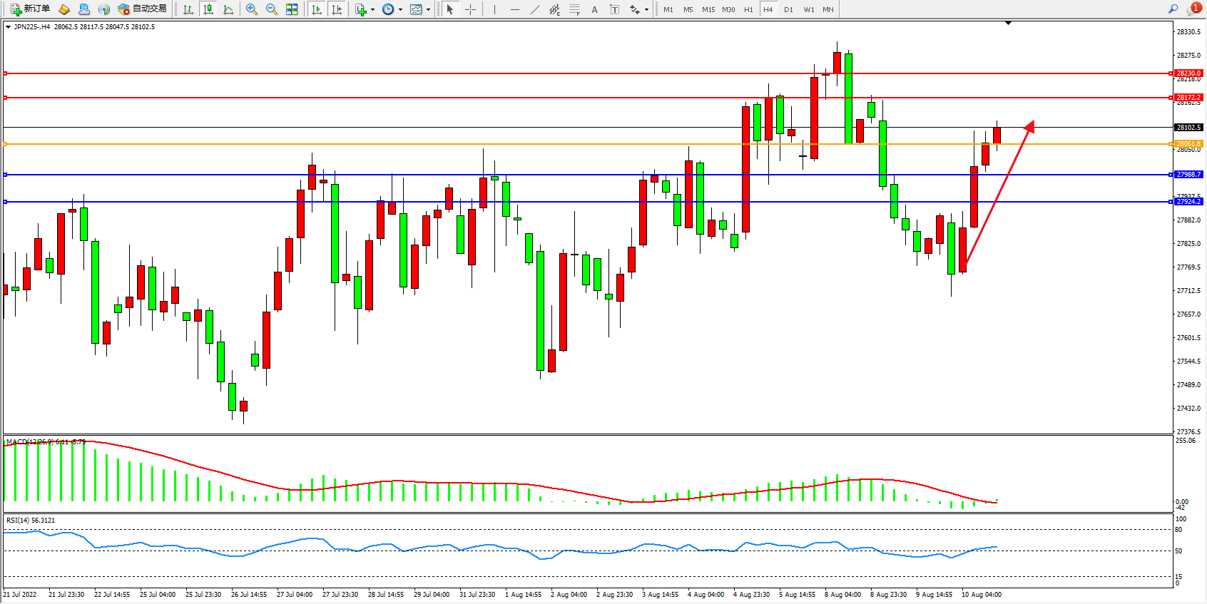 日经指数JPN225——4小时K线图显示: