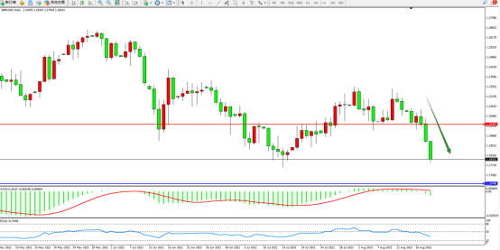 市场空头情绪笼罩,短期下行态势或将延续,前期低位近在咫尺破位在即,上方压制关注1.20414附近,低位支撑关注1.16498附近,MACD指标处于0轴线下侧徘徊,RSI指标处于50均衡线下侧弱势整理下移,如图: