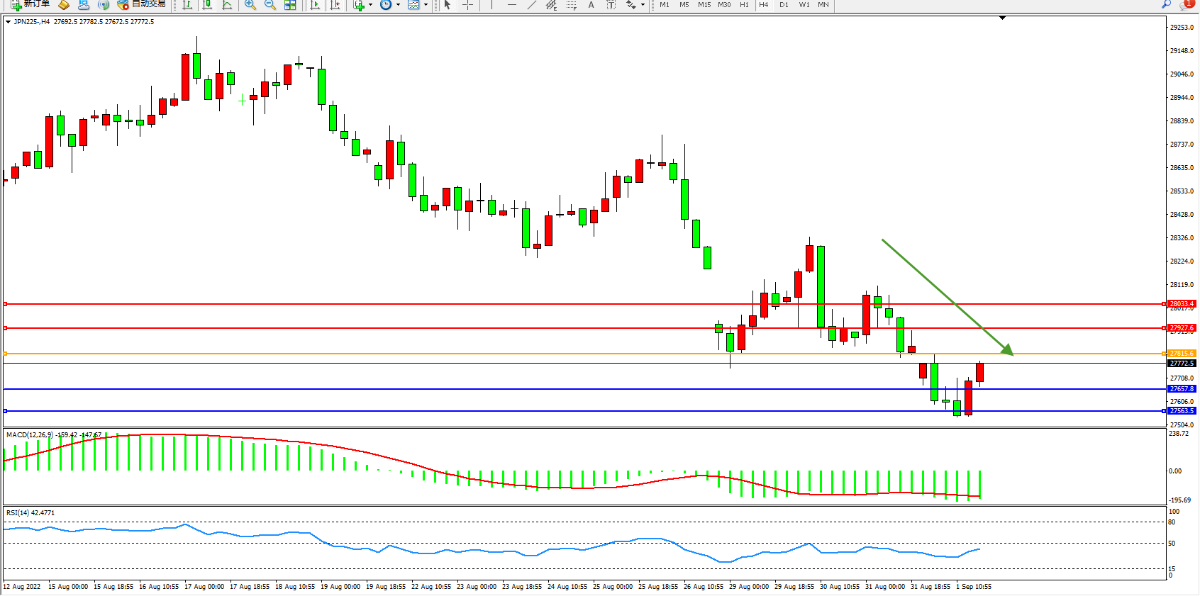 日经指数JPN225——4小时K线图显示:
