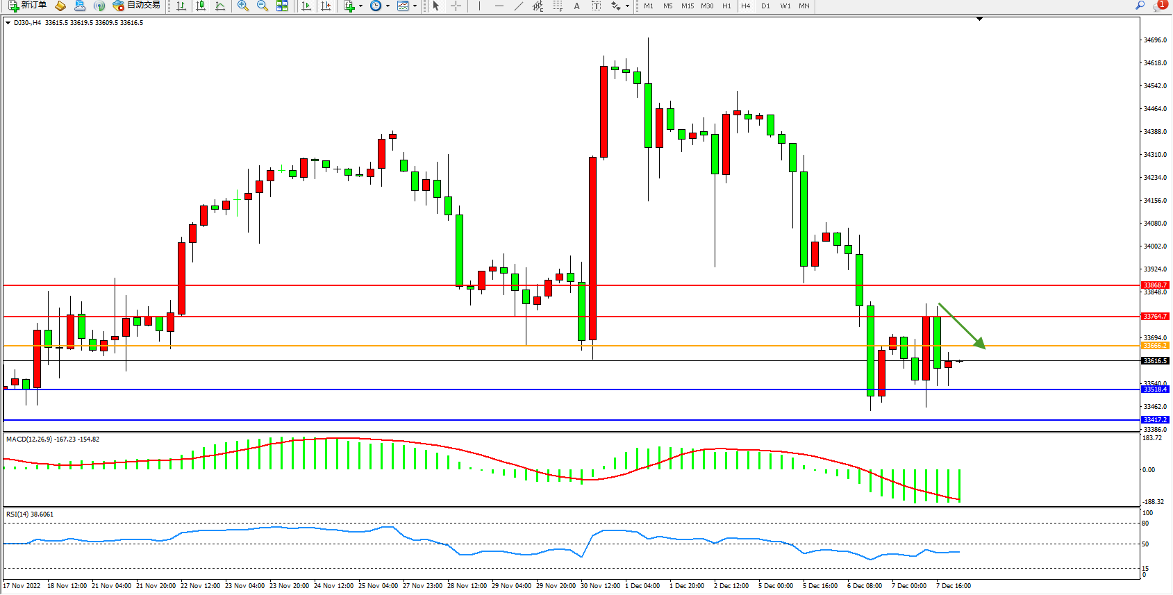 道琼斯指数DJ30——4小时K线图显示: