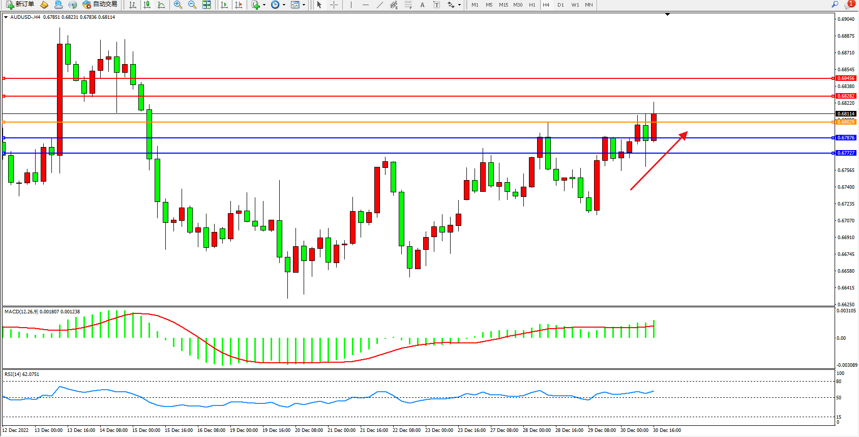 交易策略:0.68029上方看涨,目标0.68282、0.68456