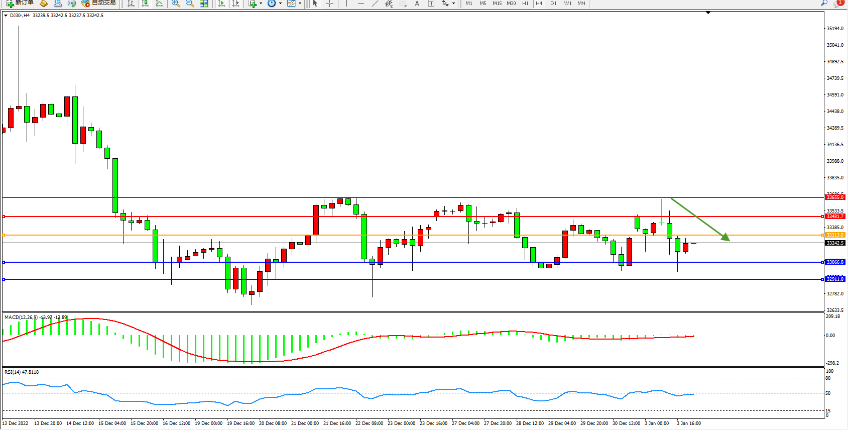 道琼斯指数DJ30——4小时K线图显示: