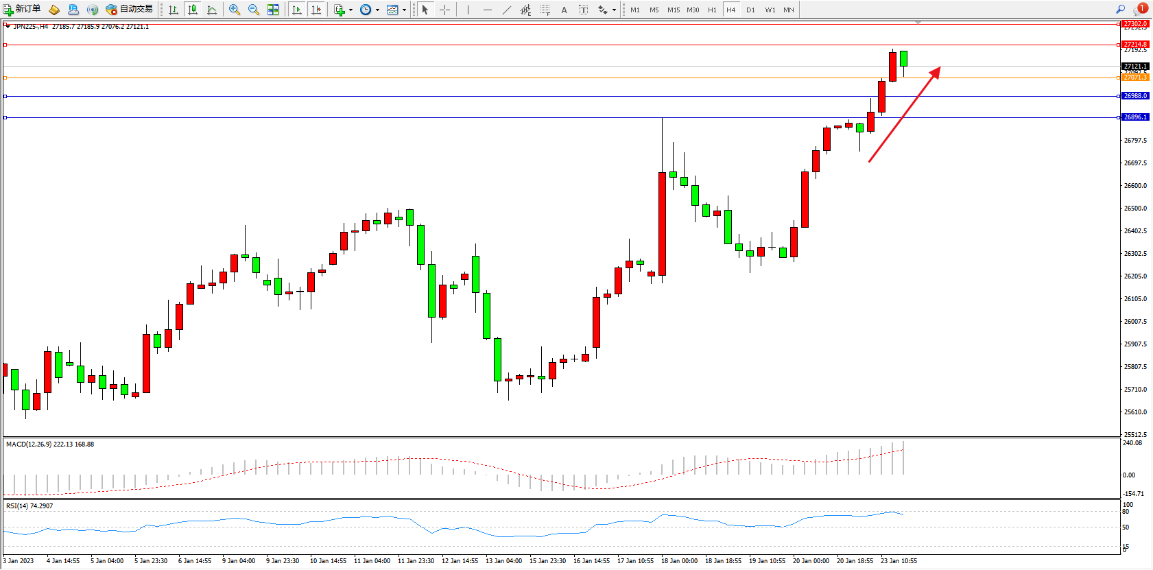 日经指数JPN225——4小时K线图显示: