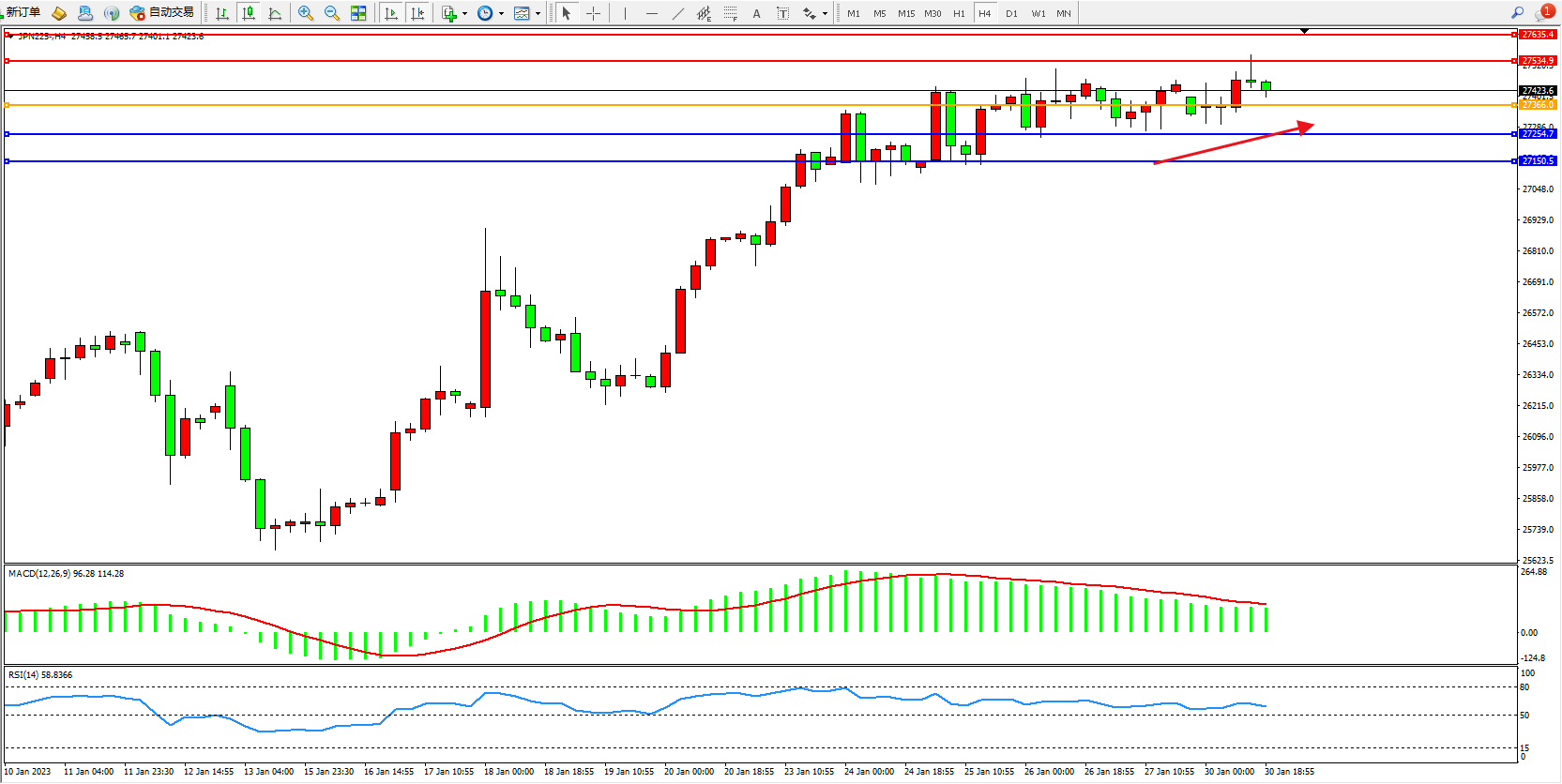 日经指数JPN225——4小时K线图显示:
