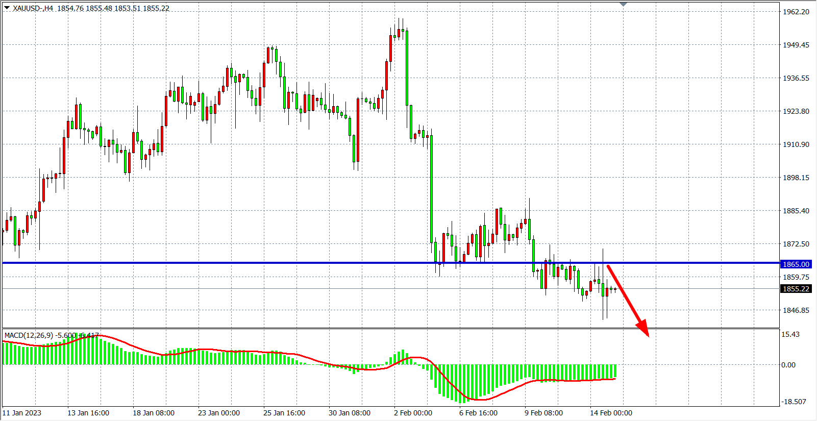 4小时图看,金价于1865受阻再度走低,MACD在零轴之下呈小幅缩量,行情短线依旧延续弱势,空头趋势延续,当前阻力继续关注1865,在该位之下继续看跌为主,下方目标1830-1830附近。