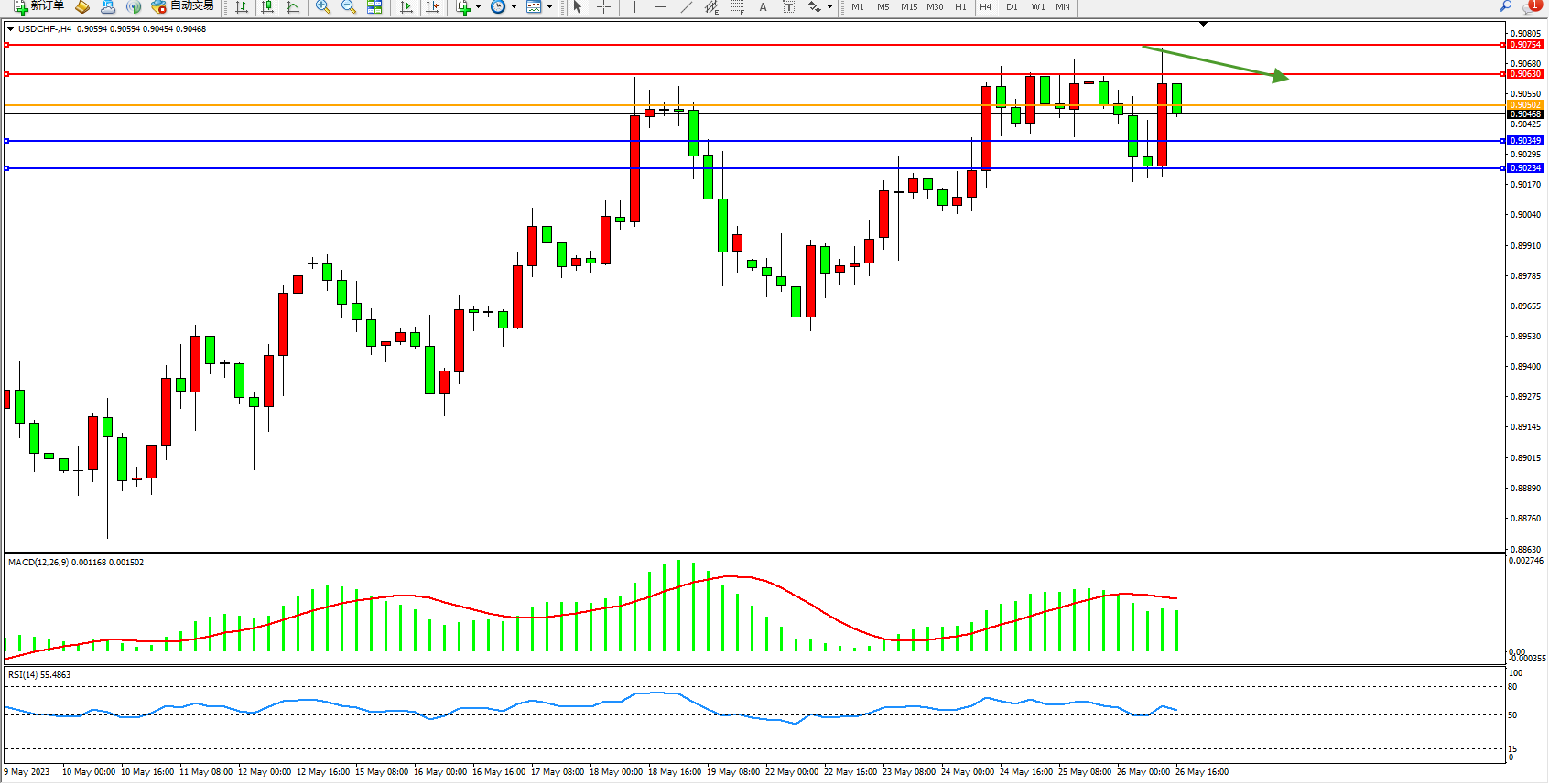 美元瑞郎USDCHF——4小时K线图显示: