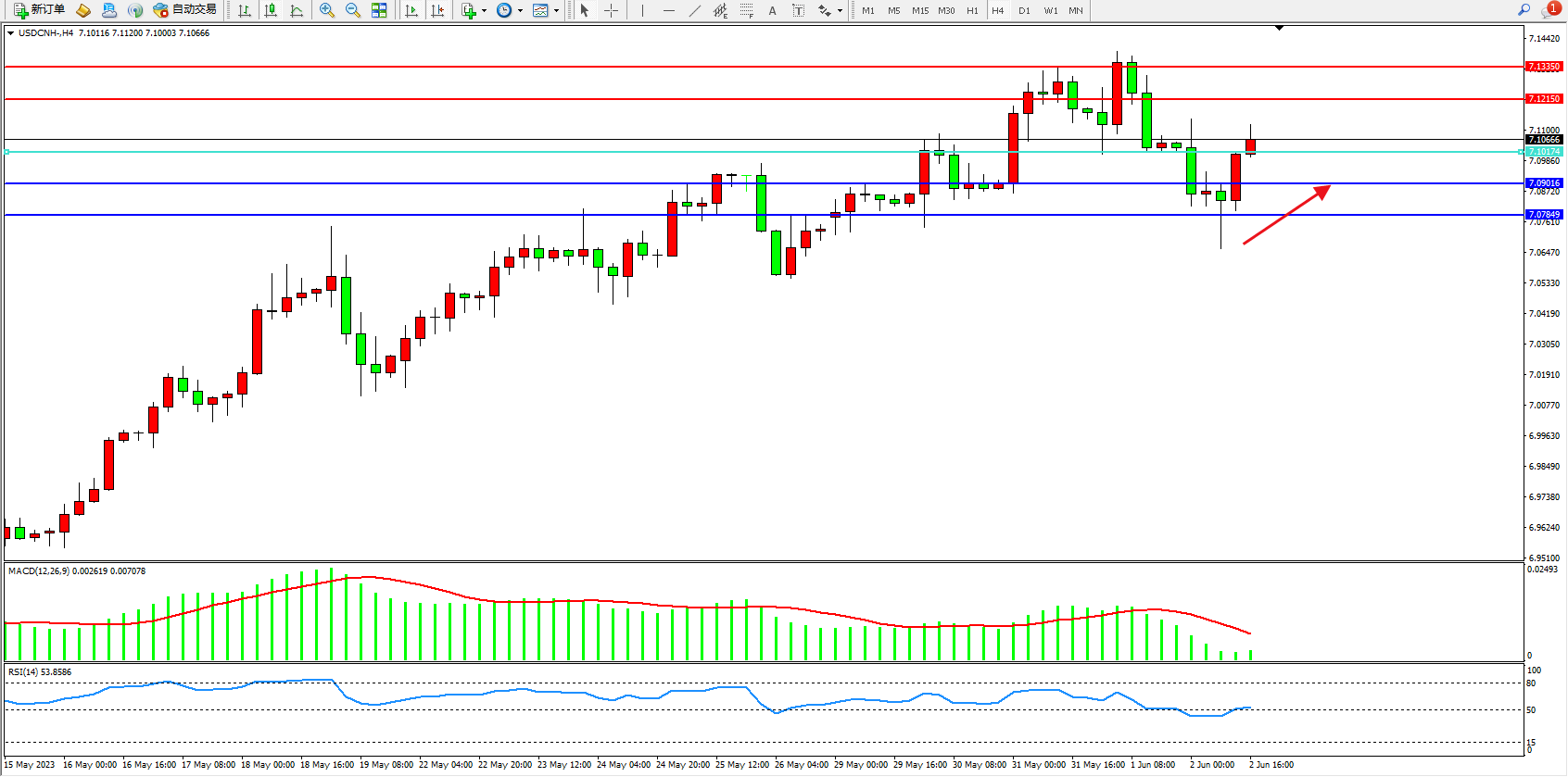 交易策略:7.10174上方看涨,目标7.12150  7.13350