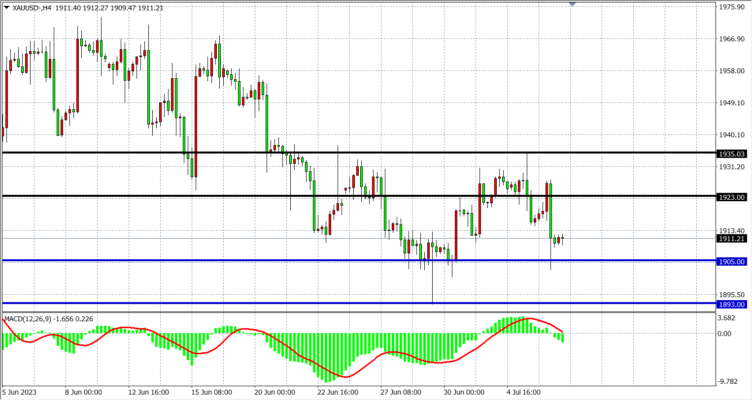 4小时图看,黄金在进一步回落挑战1900一线,MACD量能拐头下穿零轴,维持宽幅整理,阻力关注1923-1935,支撑关注1905-1893。