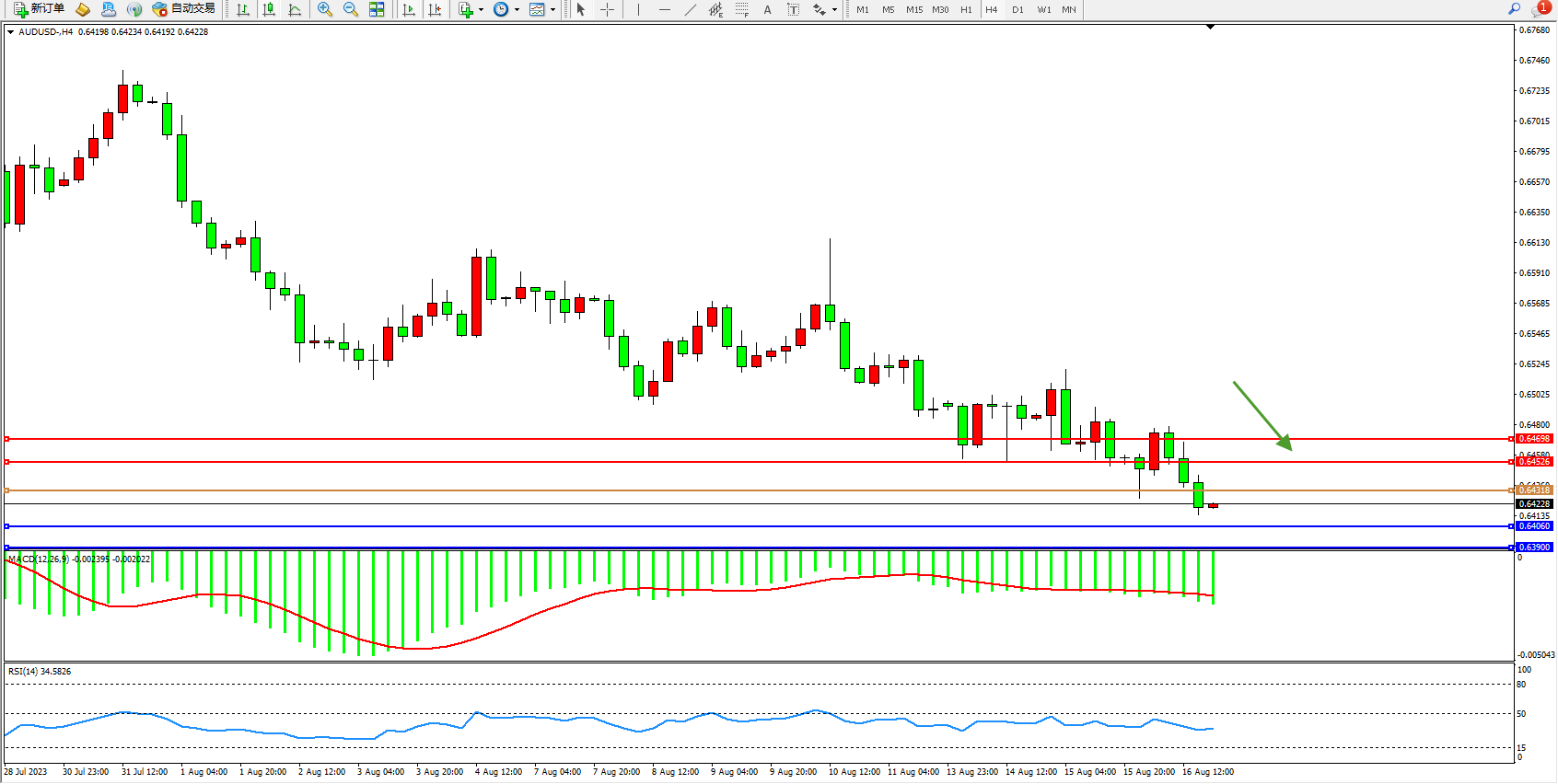 交易策略:0.64318下方看跌,目标0.64060  0.63900