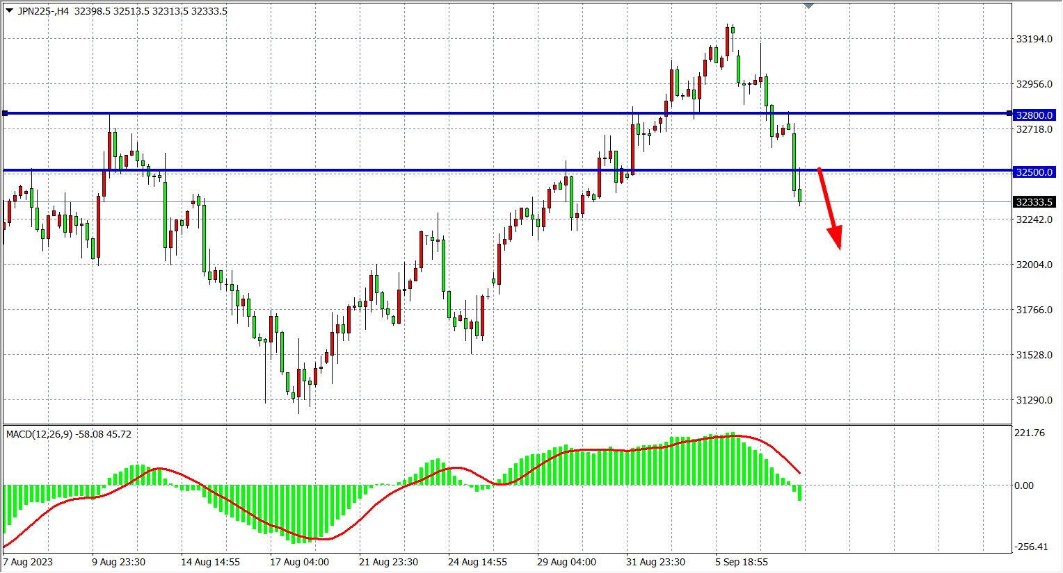 4小时图看,日经指数继回落32500之下,MACD量能下穿零轴,阻力下移32500附近,下方看32200-32000附近。