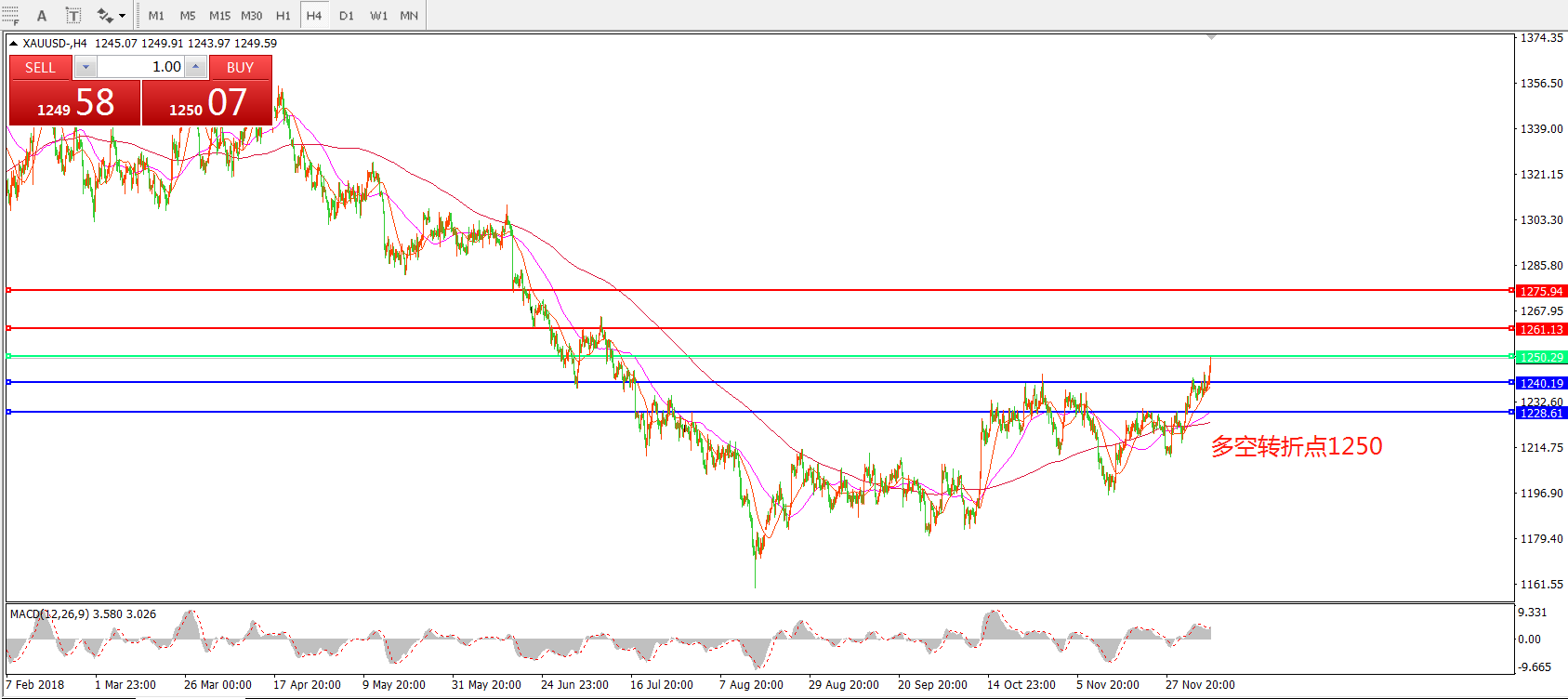 多空转折点:1250.00