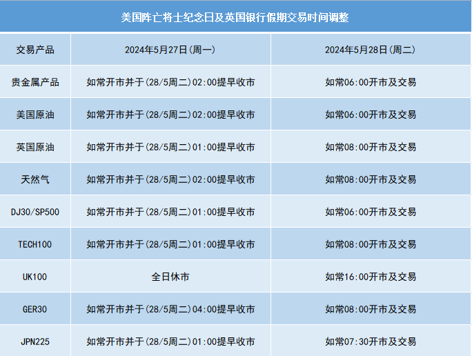 关于美国阵亡将士纪念日及英国银行假期交易时间调整通知